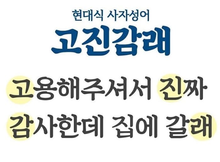 최근에는 고진감래의 원래 의미와는 다르게 '고용해 주셔서 진짜 감사한데 집에 갈래'라는 신조어로도 사용되고 있습니다. 이는 직장의 연봉이나 복지 등에 불만을 품은 직장인들이 퇴사를 희망하는 마음을 담은 표현입니다.