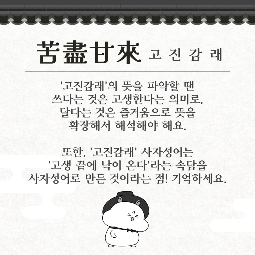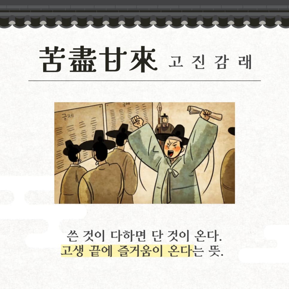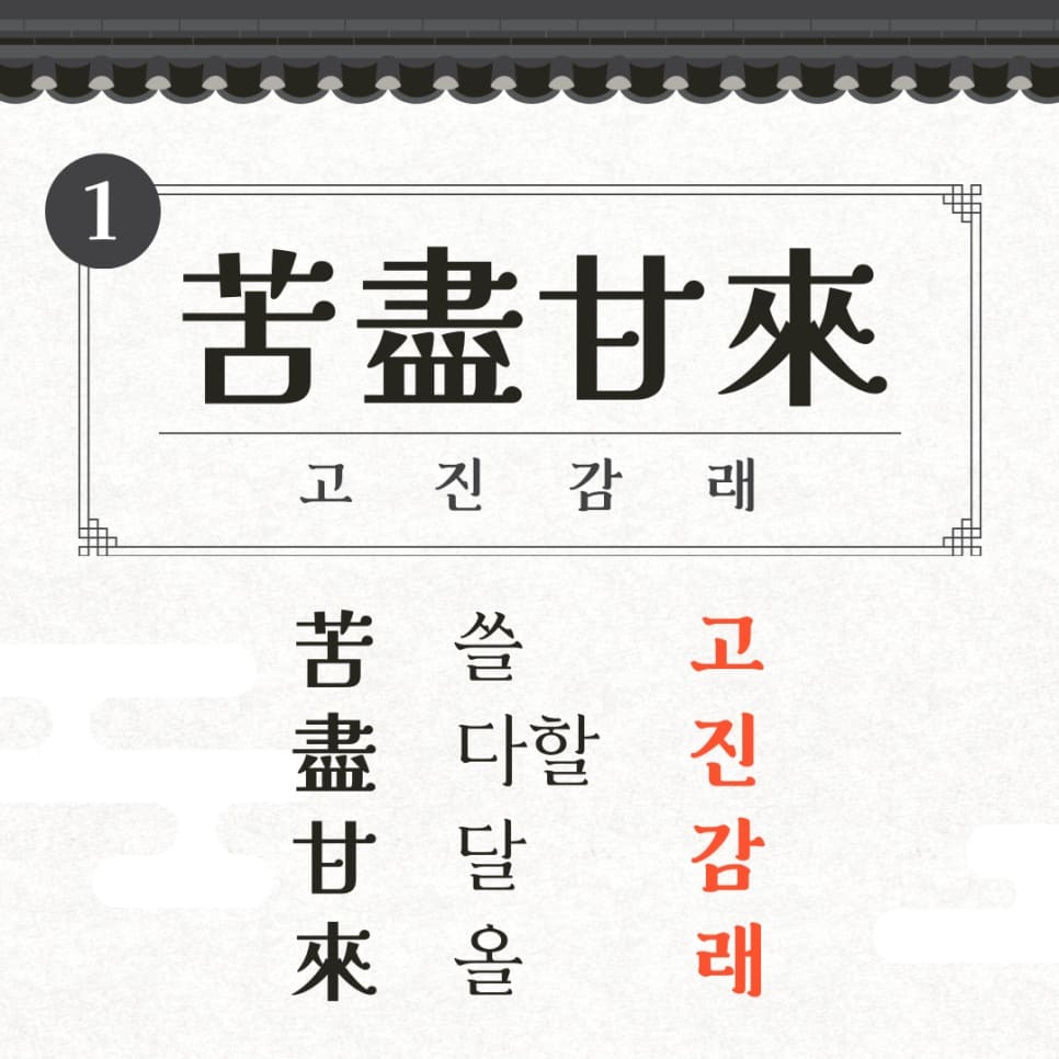 '고진감래(苦盡甘來)'는 한자어로, '쓴 것이 다하면 단 것이 온다'는 의미를 가지고 있습니다. 여기서 '苦(고)'는 쓰고 괴로움을, '盡(진)'은 다할 것을, '甘(감)'은 달콤함을, '來(래)'는 온다는 뜻을 지닙니다.